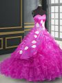 Wonderful Fuchsia Organza Lace Up Sweetheart Sleeveless Sweet 16 Dresses Brush Train Embroidery and Ruffles