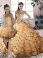 Home >  Quinceanera Dresses >  Quinceanera Dresses 2019 > Wonderful Gold Three Pieces Sweetheart Sleeveless Organza Brush Train Lace Up Beading and Ruffles Quinceanera Dresses