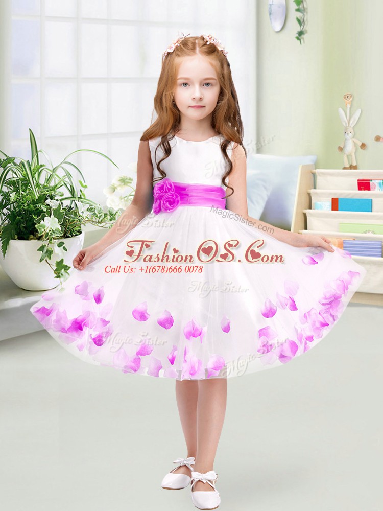 Wonderful Knee Length White Flower Girl Dress Tulle Sleeveless Appliques and Belt