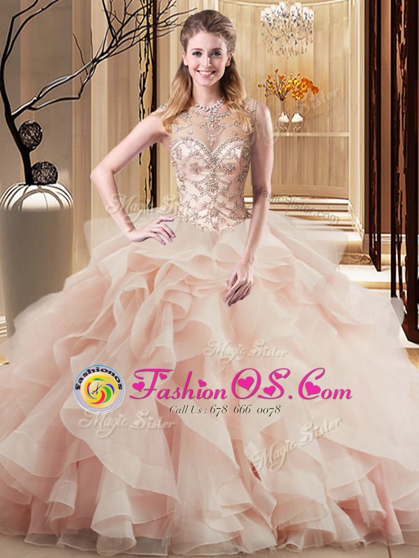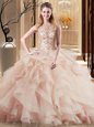 Wonderful Peach Ball Gowns Scoop Sleeveless Tulle Brush Train Lace Up Beading and Ruffles 15th Birthday Dress