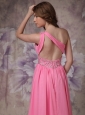 Stunning and beautiful are two words to perfectly describe this pink prom dress. It features a gorgeous one shoulder bodice that's heavily embellished with intricate beadwork and exquisite ruchings. The single strap is also heavily decorated and crosses the open back at the shoulder. The floor length skirt is so smooth and elegant that extends into a lovely brush train in the back. The open back can show your beauty and a zipper up back completes this wonderful design!