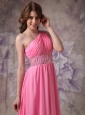 Wonderful Rose Pink Empire One Shoulder Prom Dress Chiffon Ruch And Beading Brush Train