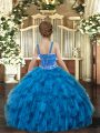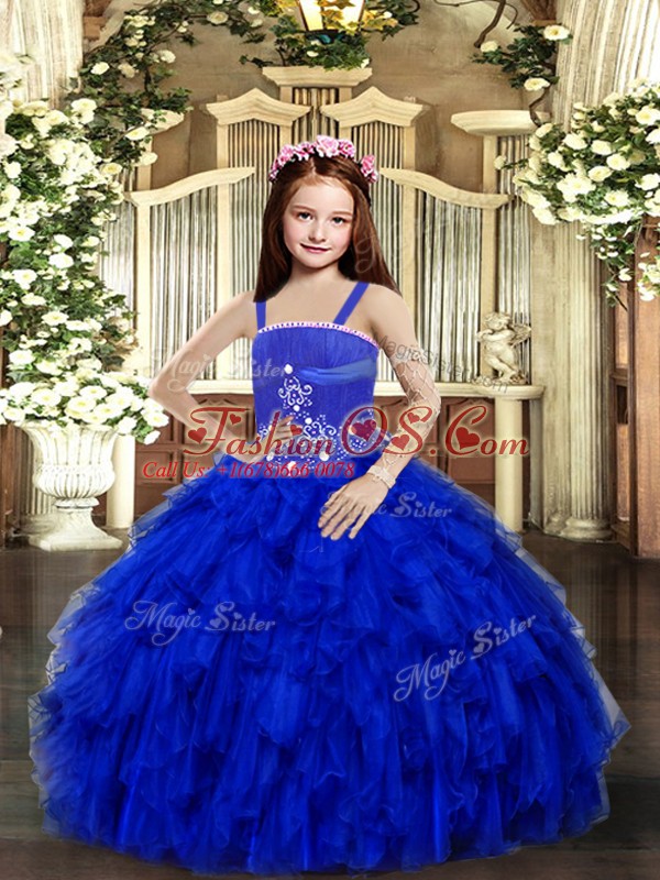 Wonderful Royal Blue Ball Gowns Beading and Ruffles Kids Formal Wear Lace Up Tulle Sleeveless Floor Length
