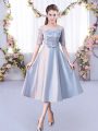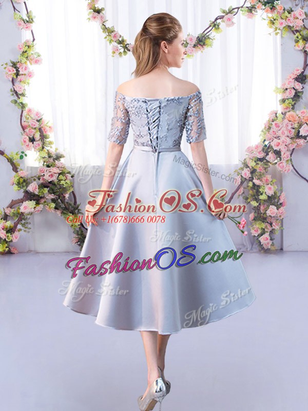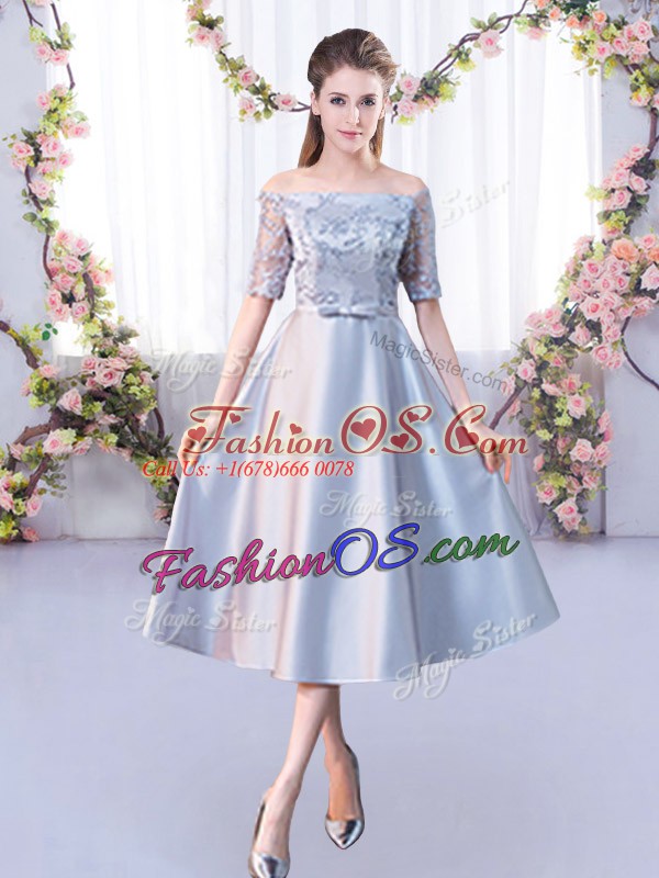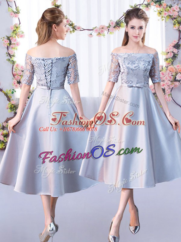 Wonderful Silver Satin Lace Up Off The Shoulder Half Sleeves Tea Length Bridesmaids Dress Lace
