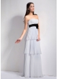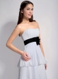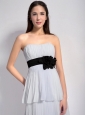 Pleated, airy material makes this dress a feast for the eyes. This dress features a modest strapless sweetheart neckline and the black waistsash accented with enchanting flowers, which add interest and detail to the mid-section of the dress. Multi-tiered chiffon skirt flows naturally, it moves graciously with you when you walk, gently sweeping the floor. A half open with zipper up back completes the whole look, both sexy and elegant. The most important merit of the dress is that the equisite design brings magical confidence.