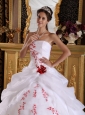 You will absolutely love this white strapless ball gown for prom, cocktail, quinceanera or special occasion party. This dress features a ruched and appliqued bodice. The waist is accented by a red rolling flower. The skirt is decorated with ruffles and appliques. Wearing this dress will surely gets a lot of compliments.