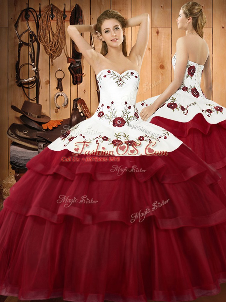 Home >  Quinceanera Dresses >  Fast Delivery Quinceanera Dresses > Wonderful Wine Red Halter Top Neckline Embroidery and Ruffled Layers Quinceanera Gown Sleeveless Lace Up