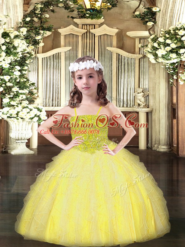 Home >  Special Occasion Dresses >  Pretty Little Girl Pageant Dresses > Yellow Ball Gowns Spaghetti Straps Sleeveless Organza Floor Length Lace Up Beading and Ruffles Pageant Gowns For Girls