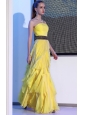 If you're inclined to add a little shine to your next special occasion, prom, or homecoming this yellow long strapless dress is a perfect choice. This long gorgeous prom dress with layers of drenched airy chiffon on the floor length skirt and the beaded belt to complete the look.