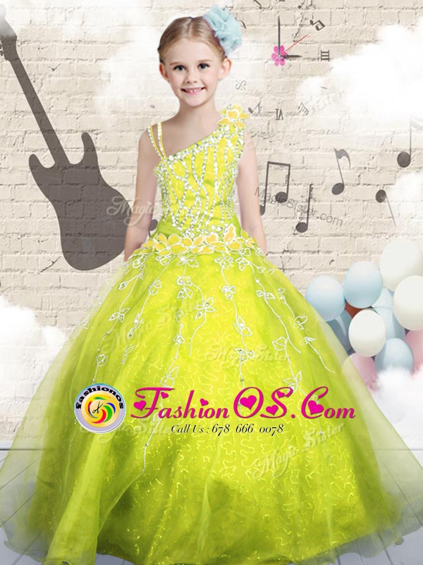 Yellow Green Asymmetric Neckline Beading and Appliques and Hand Made Flower Girls Pageant Dresses Sleeveless Lace Up