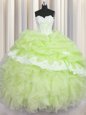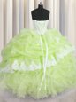 Home >  Quinceanera Dresses >  15 Quinceanera Dresses > Yellow Green Ball Gowns Organza Sweetheart Sleeveless Beading and Appliques and Ruffles and Pick Ups Floor Length Lace Up Quinceanera Gown