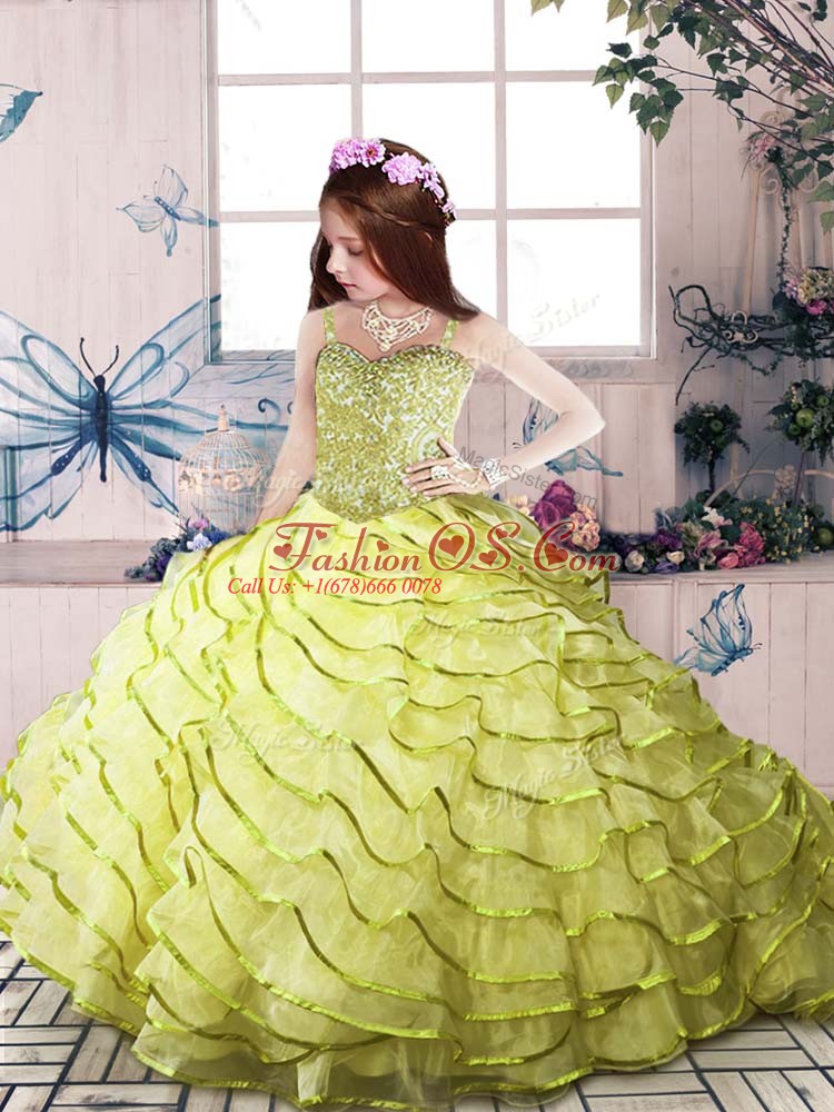 Yellow Green Ball Gowns Straps Sleeveless Organza Zipper Beading and Ruffled Layers Girls Pageant Dresses