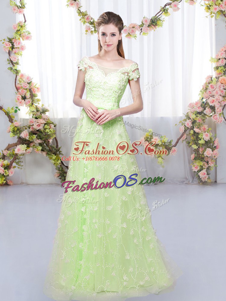 Yellow Green Lace Up Off The Shoulder Appliques Bridesmaid Gown Tulle Cap Sleeves