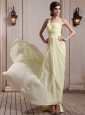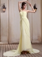 You'll absolutely love this flirty one shoulder dress for prom, cocktail or special occasion party. The yellow prom dress has a ruched bodice and drapping decorating the skirt. An elegant attached train cascades to the floor. A hidden zipper makes for easy off and on and secures the dress in place.