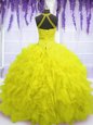 Yellow High-neck Lace Up Beading and Ruffles Ball Gown Prom Dress Sleeveless