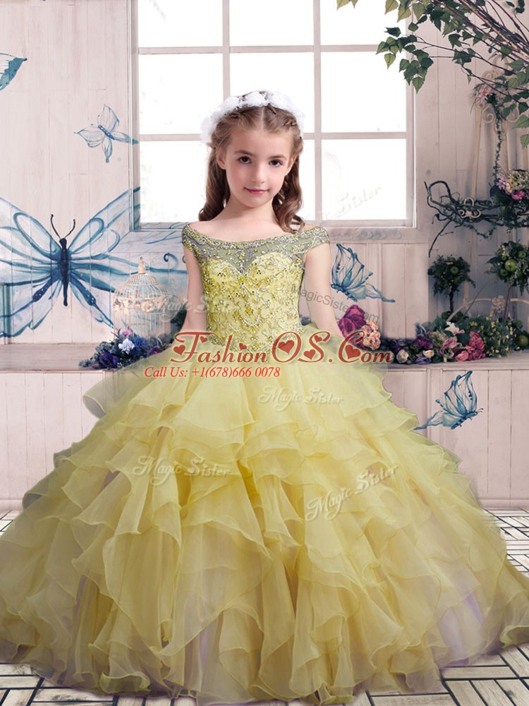 Home >  Special Occasion Dresses >  2018 Little Girl Pageant Dresses > Yellow Organza Lace Up Little Girl Pageant Dress Sleeveless Floor Length Beading and Ruffles