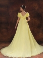 Pure white on your wedding party is not only your choice! Any color as you like can be choosen to shine your skin tone, your perfect figure. Just like this yellow wedding dress, it features short sleeves fulled with little lovely flowers. The V-shaped neckline plugging little fabric to cover your bust so that it is not revealing. The thin waistband highlight your curve. The skirt pool to floor with folds and attached a court train that adds a grand silhouette. The back has a deep V shape and a zipper up closure. At your first sight, you will love this one!
