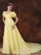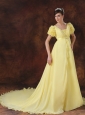 Home >  Special Occasion Dresses >  Celebrity Dresses > Yellow Square Short Sleeves Flowers Decorate Prom Dress