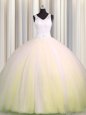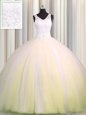 Zipple Up V Neck Light Yellow Sleeveless Tulle Brush Train Zipper Ball Gown Prom Dress for Military Ball and Sweet 16 and Quinceanera
