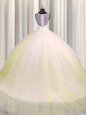 Home >  Quinceanera Dresses >  New Arrival Quinceanera Dresses > Zipple Up V Neck Light Yellow Sleeveless Tulle Brush Train Zipper Ball Gown Prom Dress for Military Ball and Sweet 16 and Quinceanera